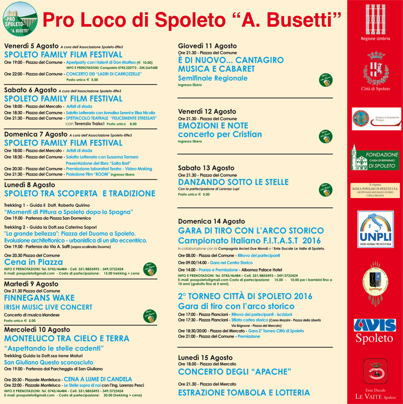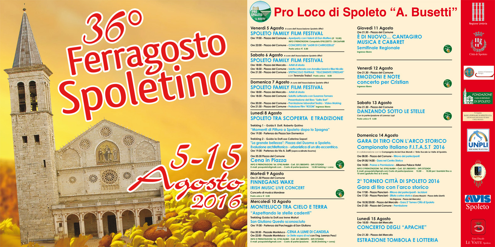 Tanti gli appuntamenti estivi organizzati dalla Proloco di Spoleto, dal 5 al 15 agosto: il Torneo Nazionale di Tiro con l’Arco, la cena sotto le stelle a Monteluco, una serata dedicata alla danza in Piazza del Comune, musica, momenti conviviali e trekking urbani e poi l’appuntamento storico con la tombola in Piazza del Comune, un concerto di musica irlandese, la semifinale regionale del Cantagiro; quest’anno è prevista anche una novità, l’evento Spoleto Family Film Fest, organizzato dalla Lux Vide, la nota società di produzione televisiva famosa per la fiction Don Matteo e, dall’Associazione Fiuggi Family Festival che organizza eventi multimediali destinati alle famiglie in collaborazione con il Comune di Spoleto, Pro Loco Spoleto, ConSpoleto, Confcommercio Spoleto. L’evento che si terrà dal 5 al 7 agosto ha un contenitore ampio, con proiezioni, concerti, incontri, spettacoli, laboratori, con il cast di Don Matteo, Susanna Tamaro, i Ladri di Carrozzelle, Terenzio Traisci; è dedicato al cinema e rivolto alle famiglie, con attività per qualsiasi età, in modo da mostrare al pubblico ciò che solitamente si è abituati a vedere sullo schermo: i film, i personaggi più amati, fornendo spunti di riflessione sul tema che ogni anno diventa motivo di dialogo.