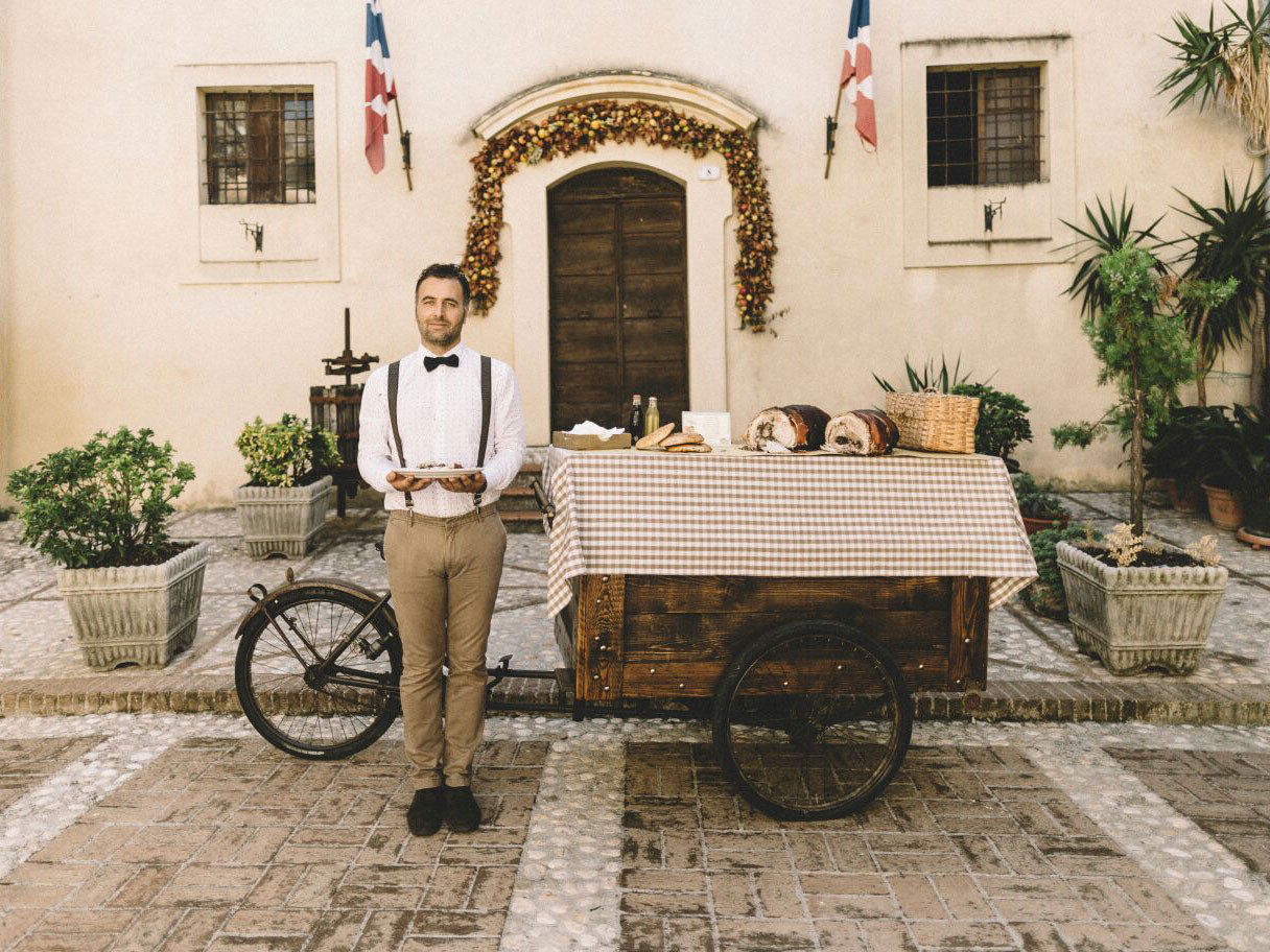 SAN GEMINI (TR) – Quando qualità e passione sono un binomio vincente! A San Gemini, Luca Quintili trasmette con tutta la sua passione, la tradizione, il territorio e i valori attraverso un lavoro antico, ma reso moderno da una vivace mente creativa. La maggior parte delle volte quello che ci tramandano i nostri nonni, sono un insieme variegato e profondo di un universo immateriale ed estremamente complesso, che ti accompagna in un tumulto di emozioni, sensazioni, piacere, per tutta la vita: sono i ricordi, quelli che ti tornano in mente da un odore percepito, un sapore riscoperto. E poi, ci sono persone, come Luca Quintili, che riescono a prendere tra le mani tutti questi valori immateriali, concentrarli e renderli sotto altre forme, visibili, godibili da tutti. I valori crescono e si rafforzano tra i vicoli storici di San Gemini, dove Luca ha dato vita alla sua passione più grande: continuare il lavoro del nonno. Ha preso in mano coltelli e e tutto quello che conosceva, e ha iniziato a fare i salumi e la porchetta cuocendola in un antico forno a legna che apparteneva al convento di San Giovanni Battista, che risale al 1199. E allora Luca parte dal concetto che il maiale è un animale nobile e troppo trattato male, dagli allevamenti, fino alla produzione industriale: va nobilitato. Così, papillon al collo e signorilità, non solo professionalità, serve i suoi capolavori, con rinnovati valori; sapori che accarezzano le papille, prodotti e clienti coccolati da Luca. È così che riesce a raccontare la storia con sapori eccellenti, veri, antichi, quelli dei ricordi. E per raggiungere proprio tutti, non si accontenta del suo negozietto piccolo piccolo, dove c’è il forno, ma ha creato un suo speciale mezzo di trasporto, ha restaurato una bicicletta cassonata del 1920, che utilizza per banchetti o feste; ma stà anche finendo di restaurare una roulotte laika del 1963 adibita alla vendita dei suoi prodotti. Si, perché quando il gusto di un cibo ti spalanca sensazioni piacevoli e di benessere e torni a spizzicare il salame, per poi mangiare ancora una fetta di prosciutto, ma anche il formaggio… allora tutto acquista una nuova prospettiva, una nuova visione. In questo mondo di approssimazione e certificazioni, uno spirito libero, ricerca con passione quasi estrema la qualità nei suoi prodotti finali. Per cui una filiera estremamente corta e la selezione personale. Poi, cuore e amore per quello che si fa, immaginando il piacere di chi mangerà le sue creazioni. Non c’è bisogno di essere un grande Chef stellato; ma una sorta di artista visionario che vede il domani. Un modo di renderci la realtà in un ritorno ai ritmi calmi e sinceri della vita di paese, dove ancora i bambini sono di tutti, Valori da preservare. E il tempo non racconta bugie, i sogni diventano realtà, fatta di carne e ossa.