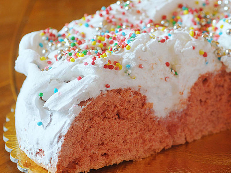 La ciaramicola è una torta a forma di ciambella, di colore rosso perchè imbevuta di Alchermes, con glassa bianca e confettini colorati a copertura.