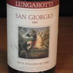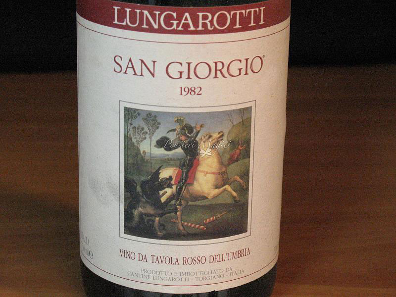 Gli anni ’60 hanno segnato un punto di svolta per la qualità del vino, per la voglia di dimostrare la potenzialità dell’Italia al resto del mondo enologico allora conosciuto. E questo è stato. Lungarotti ha saputo esprimere la tradizione della campagna umbra, amalgamandola con quei vitigni che stavano facendo la grandezza della Francia. Da qui nascono nuove espressioni, raffinati vini, longevità più importanti. I vini non sempre sono facili ed immediati, vanno anche aspettati, accolti e compresi. Così è per il San Giorgio, vino che vuole restare legato al territorio di Torgiano anche tramite i tradizionali fuochi che il 23 aprile vengono accesi in onore del santo, dove vengono bruciati i sarmenti delle potature. Nasce così questo SuperUmbrian, nel 1977, per volontà di Giorgio Lungarotti, ma è nella bottiglia che si completa l’alchemico incontro tra la tradizione, della personalità del Sangiovese ammorbidito dal Canajolo, con quell’accento inconsueto per l’Umbria, che viene dal Cabernet Sauvignon della vigna San Giorgio. E come tutti i bravi alchimisti sanno, è il tempo che rende grande un’opera. Infatti questo vino viene messo in commercio almeno dopo 6 anni in bottiglia se non dopo 8, perché deve esprimere tutta la sua finezza, ma anche la carica emotiva di forza, di lotta e passione, proprio come il famoso dipinto di Raffaello, ripreso in etichetta, in cui le dolci colline umbre fanno da sfondo alla scena.