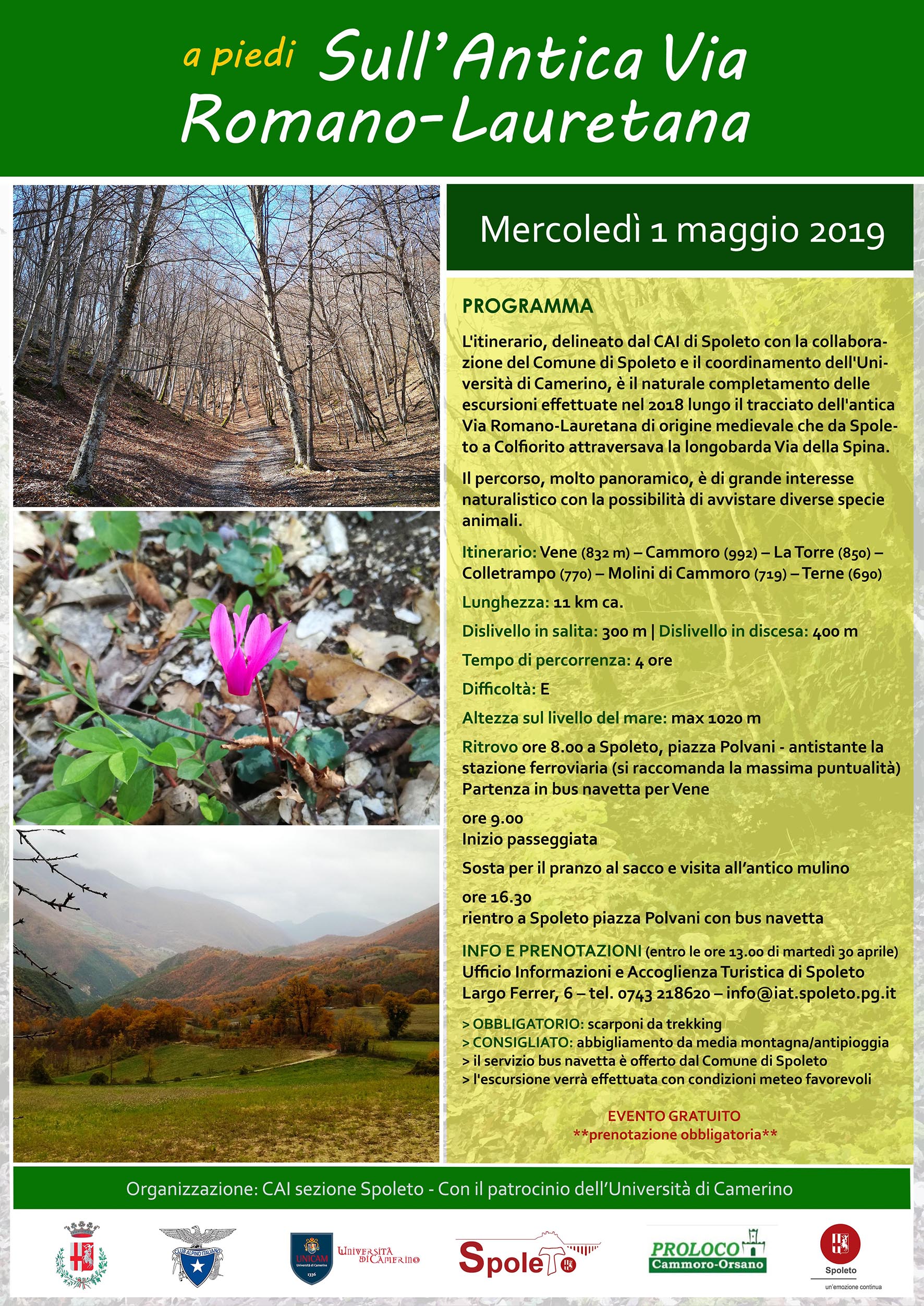 L’itinerario, con partenza dalla Stazione FS di Spoleto, toccherà Vene (832 m), Cammoro (992 m), La Torre (850 m), Colletrampo (770 m), Molini di Cammoro (719 m) con sosta per il pranzo al sacco e visita guidata all’antico mulino a cura della PRO-LOCO di Cammoro/Orsano, Terne (690 m).