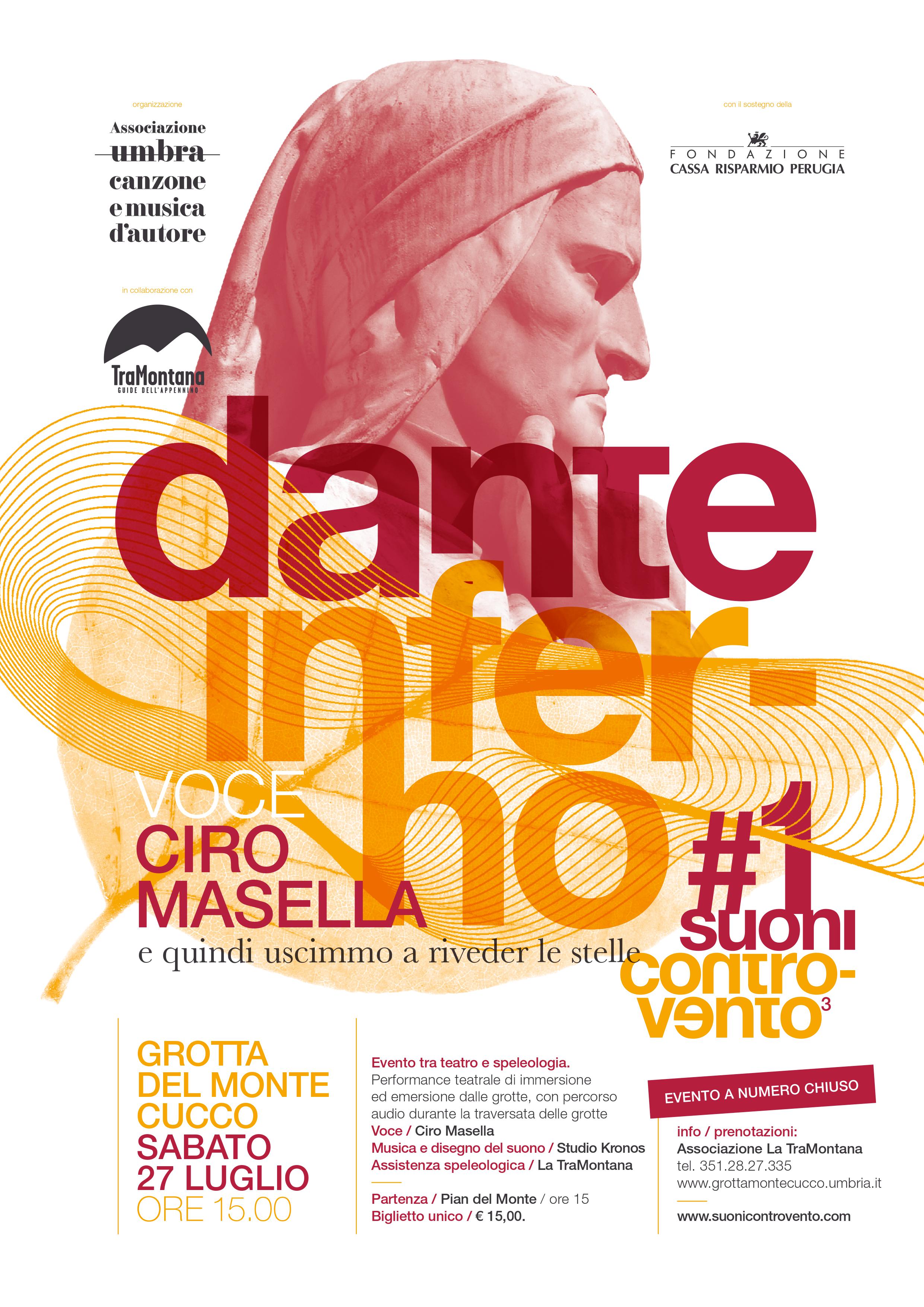 PARCO DEL MONTE CUCCO – Dopo l’annuncio del concerto di apertura della terza edizione di Suoni Controvento, che vedrà protagonista Marco Mengoni, l’Associazione Umbra della Canzone e della Musica d’Autore svela un nuovo appuntamento del festival in scena nei borghi di Fossato di Vico, Sigillo e Costacciaro dal 21 al 28 luglio. Sabato 27 luglio alle ore 15.00 nella Grotta di Monte Cucco (con partenza da Pian del Monte) ad andare in scena sarà il progetto Divina Commedia Dante-Inferno #1, performance teatrale di immersione ed emersione dalle grotte, con percorso audio durante la traversata delle grotte. Voce di Ciro Masella, musica e disegno del suono Studio Kronos, assistenza speleologica dell’Associazione La Tramontana.