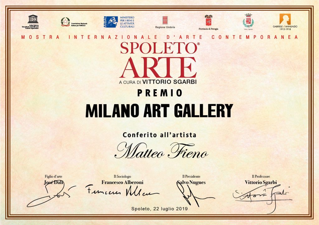 La giuria artistica, composta dal direttore di Milano Art Gallery, nonché presidente di Spoleto Arte, Salvo Nugnes, dal prof. Vittorio Sgarbi, e dal sociologo Francesco Alberoni, ha assegnato all’artista piemontese Matteo Fieno il Premio Milano Art gallery.