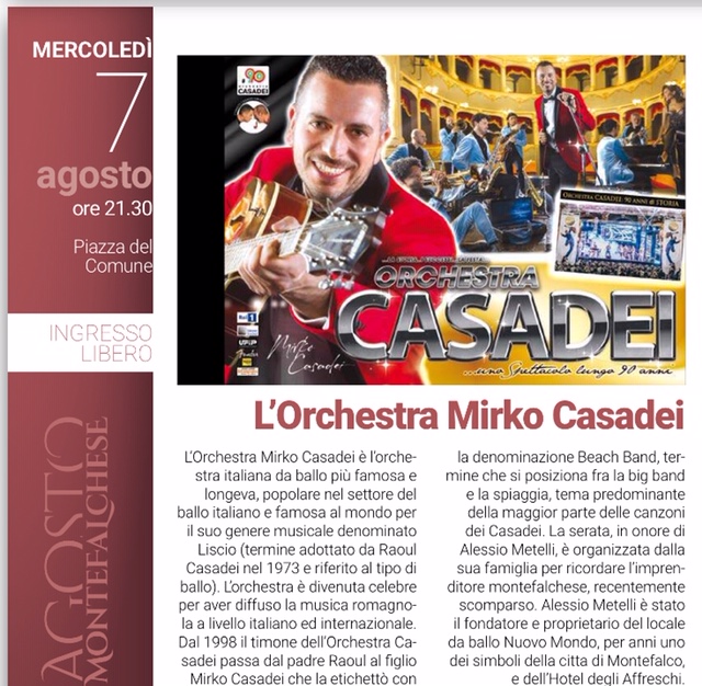 Mercoledì 7 agosto alle 21.30 sul palco di Piazza del Comune si esibirà l’orchestra di Mirko Casadei, l’orchestra diventata celebre per aver diffuso la musica romagnola a livello italiano ed internazionale. Dal 1998 il timone dell’orchestra Casadei passa dal padre Roul al figlio Mirko Casadei che la etichettò con la denominazione Beach Band, termine che si posiziona fra la big Band e la spiaggia, tema predominante della maggior parte delle canzoni dei Casadei.
