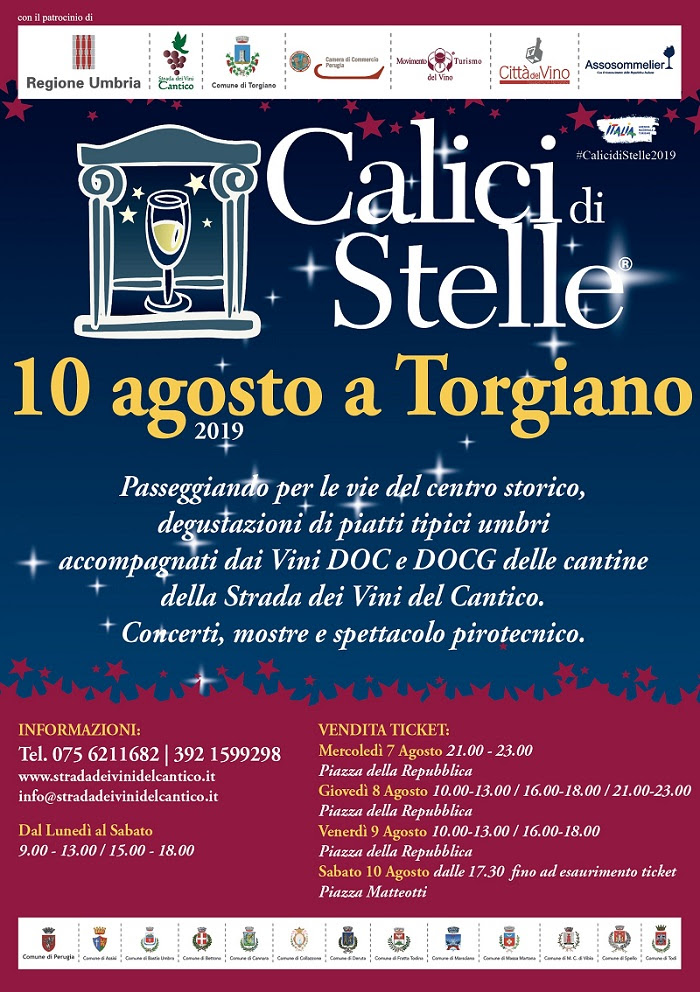TORGIANO (PG) – Sabato 10 Agosto torna Calici di Stelle, l’attesissimo appuntamento estivo promosso dal Movimento Turismo del Vino e Città del Vino che, inneggiando a Bacco, in una delle notti più suggestive dell’anno, offre ai visitatori la possibilità di godersi “la pioggia di lacrime di San Lorenzo” in compagnia del vino di qualità.