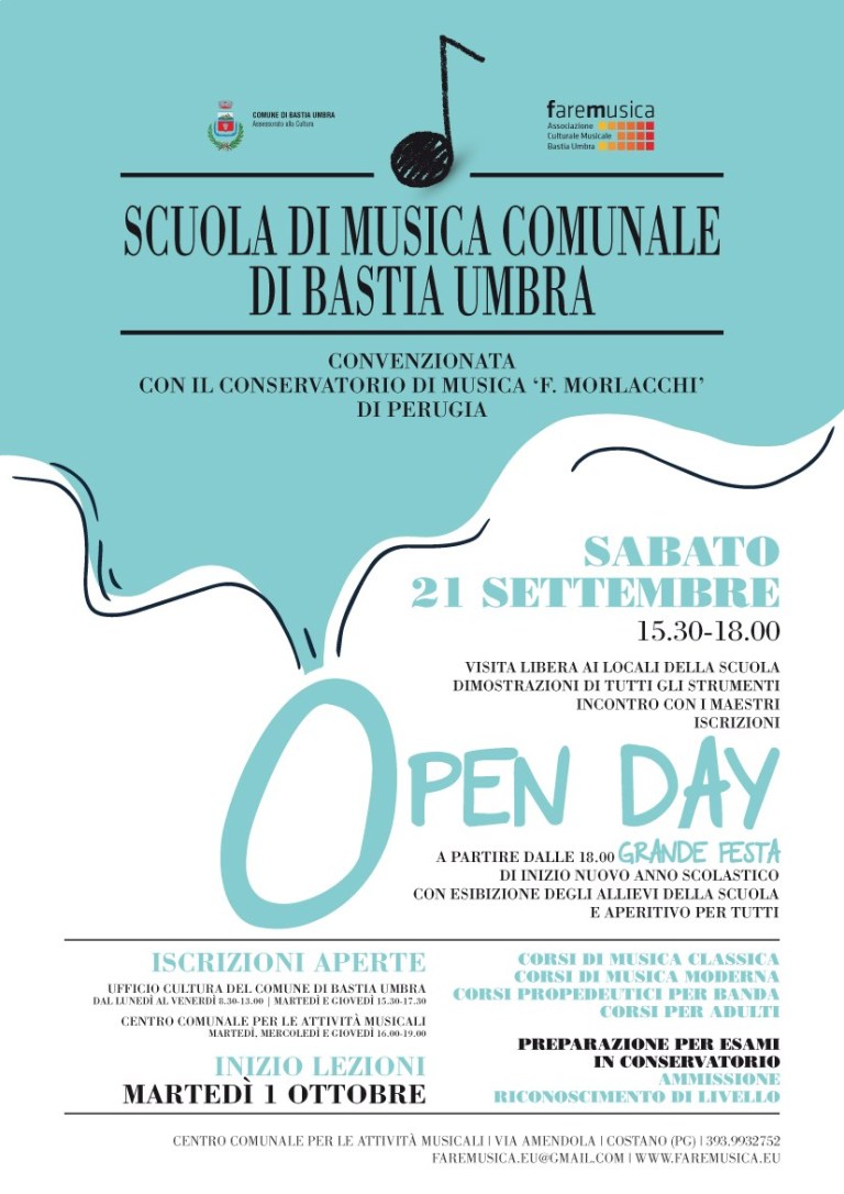 BASTIA UMBRA (PG) – Sabato 21 Settembre, dalle 15.30 alle 18.00, Open Day della Scuola di Musica Comunale di Bastia Umbra: tutti quelli che vorranno potranno fare conoscenza della Scuola, visitandone liberamente i locali, siti presso il Centro Comunale per le Attività Musicali a Costano, assistere a dimostrazioni di tutti gli strumenti, fare conoscenza con il Direttore e con tutti i Maestri, avere tutte le informazioni necessarie ed anche iscriversi. La Scuola sarà praticamente divisa in due: dalla parte dell’Aula Magna tutti i docenti degli strumenti dell’area di Musica moderna (Canto moderno, Chitarra elettrica, Pianoforte moderno e tastiere elettroniche, Basso elettrico e Batteria), dall’altra parte, nel corridoio delle aule, tutti gli altri strumenti dai Fiati agli Archi, al Pianoforte, alla Fisarmonica e alla Chitarra classica.