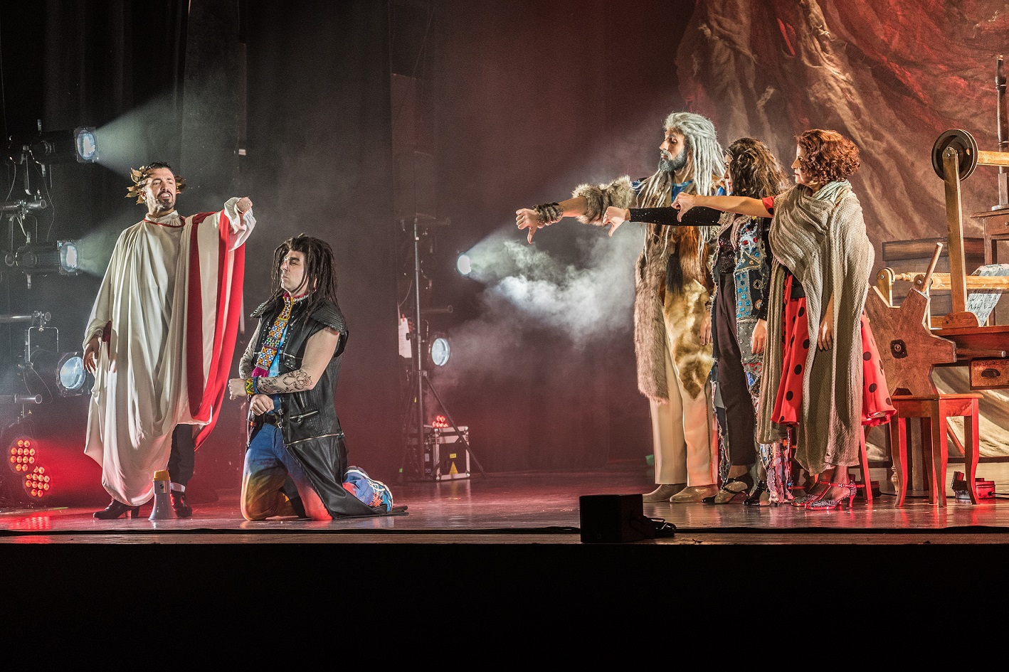 La Bibbia Riveduta e Scorretta spettacolo scritto da Davide Calabrese, Lorenzo Scuda, Fabio Vagnarelli, musiche di Lorenzo Scuda, interpretato da Graziana Borciani, Davide Calabrese, Francesca Folloni, Lorenzo Scuda, Fabio Vagnarelli (gli Oblivion), scene e costumi di Guido Fiorato, luci di Aldo Mantovani, coreografie di Francesca Folloni, regia Giorgio Gallione.