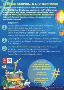 La sfida di lettura è in 3 mosse: 1) Ricercare poesie, racconti, storie, aneddoti, descrizioni tramite libri o siti internet su ciò che si ama del proprio territorio comunale: scorci, monumenti, personaggi, cibi, prodotti, paesaggi; 2) Creare un post sulla propria pagina Facebook e/o Instagtram con un breve video, un disegno, un’immagine corredati del testo che li riguarda; 3) Menzionare nel proprio post @