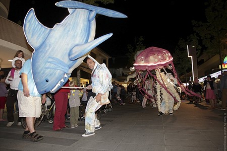 Con questa improvvisazione iniziale, nasce davanti al pubblico, una fantastica visione, gli scarni elementi scenici, si uniscono, diventano barca, pronta a solcare i mari del racconto, sfilando per le strade seguita da pupazzi alti all’incirca tre metri, sempre pronta a trasformarsi, ancora e sempre a vista, nei luoghi del racconto stesso, eccola quindi diventare un enorme teatro da burattini per ascoltare e vedere la tragica storia d’amore tra una sirena ed un marinaio, messa in scena dai pupazzi della parata, ora enormi burattini e bunraku; o teatro d’ombre per narrare come è che Colapesce, dal profondo del mare regge le sorti di noi tutti