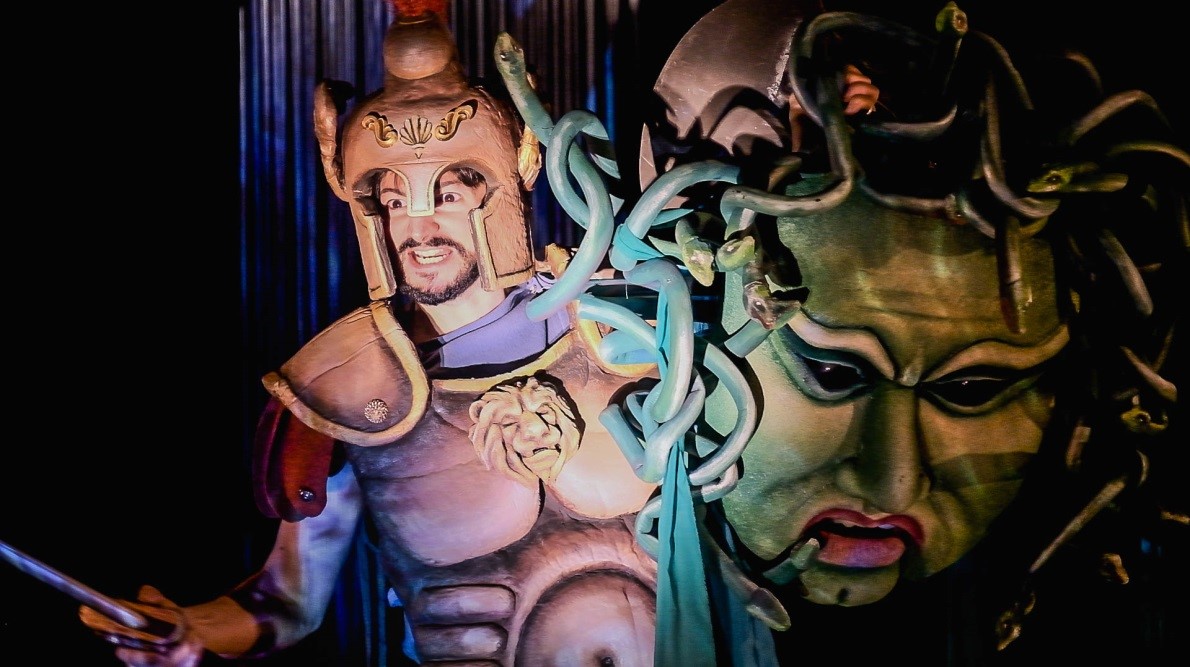 Noi attraverso il nostra teatro dell’Immaginario proponiamo in forma semplice ed accessibile ai ragazzi storie che sicuramente li affascineranno e forse attraverso la meraviglia che solo il teatro sa generare li faranno riflettere.E’ uno spettacolo di grandi dimensioni, propone figure di diverse grandezze, in un continuo susseguirsi di azioni sceniche di grande effetto, ed attori, che agiscono in simbiosi con le figure interpretando anche ruoli propriamente teatrali. Le Figure, alte quasi due metri, incarnano i più noti eroi: Prometeo, Perseo, Teseo, Icaro ed altri, sono animate parzialmente a vista ed agiscono talvolta con altre figure di grandi dimensioni, quali il gigante Polifemo, Medusa e le Gorgone , il Minotauro, draghi e serpenti marini. Il tutto in un contesto scenografico ricco di suggestioni prodotte da una macchina teatrale in continua trasformazione e da immagini proiettate che ricreano i luoghi scenici accentuando il loro fascino.