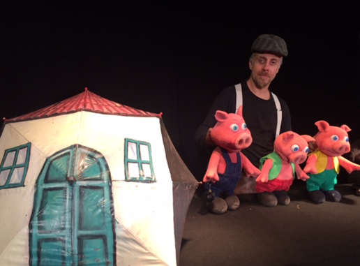 Questa volta è l’ombrello il contenitore della fiaba che diventa ambiente dove escono fuori i burattini personaggi, il lupo e i porcellini, si trasforma in casa, luogo di protezione ma al tempo stesso luogo di scontro tra le figure protagoniste e il lupo antagonista. Quella dei tre porcellini è una fiaba che affronta il tema della crescita. I tre porcellini sono la rappresentazione del bambino che cresce, passando attraverso gli errori e le brutte esperienze. Essa insegna in maniera semplice quanto sia importante impegnarsi senza pigrizia in ciò che si fa per poter sfuggire ai pericoli che la vita futura può provocare.