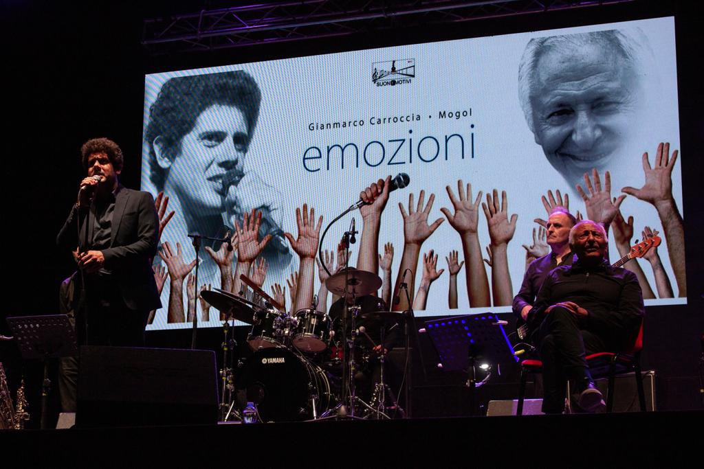 Gubbio-DOC-Fest-Mogol-inGUBBIO (PG) – Un tuffo entusiasmante nel passato, tra le canzoni più amate dell’indimenticato Lucio Battisti: questo e molto altro è stato ieri sera lo spettacolo “Emozioni – viaggio tra le canzoni di Mogol e Battisti”, che ha visto esibirsi sul palco del “Gubbio DOC Fest” 2020, in Piazza Grande, il più grande autore di testi di musica italiana, Mogol, e uno tra i più talentuosi cantautori del momento, ex allievo della scuola CET di Mogol, Gianmarco Carroccia.