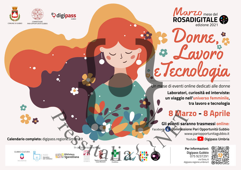 LocandinaROSADIGITALE-inGUBBIO (PG) – Un viaggio nell’universo femminile, fatto da eventi, tutti rigorosamente online, dedicati alle donne e al loro mondo, tra lavoro, tecnologia, educazione. Questo e non solo questo sarà “Donne, lavoro e tecnologia”, il mese che la Commissione Pari Opportunità, con la partecipazione attiva di Digipass Gubbio, dedica ad approfondimenti, eventi, letture e laboratori per tenere alti i riflettori sull’universo femminile.