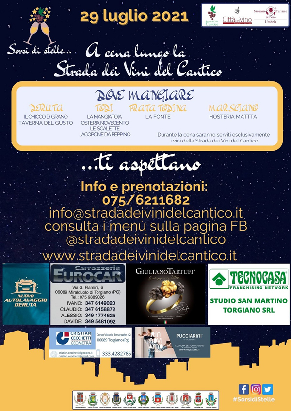 Sorsi-di-stelle-inTORGIANO (PG) – Dopo l’esperienza del 2020, anche quest’anno si torna a cenare e passeggiare lungo la Strada dei vini del Cantico. È al via infatti, la seconda edizione dell’evento ‘Sorsi di stelle’.