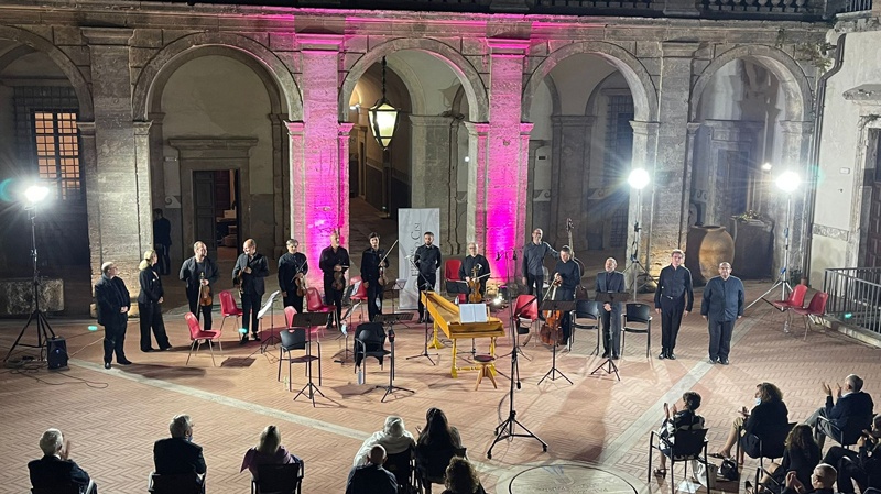 Il Festival ha registrato il suo atto conclusivo giovedì 9 settembre a palazzo Cesi ad Acquasparta con questa prima esecuzione in tempi moderni dell’opera sacra “Il Martirio di San Terenziano”, dedicata al Santo che fu vescovo di Todi nel I secolo dopo Cristo. Si tratta di un oratorio inedito scritto nel 1718 da uno dei più noti compositori della sua epoca Antonio Caldara su libretto di Giuseppe Piselli, nato a Todi alla fine del ‘600, per soli, ensemble vocale e strumentale. Un’esibizione unica, che è stata molto apprezzata dal pubblico presente, frutto di un progetto realizzato dall’associazione Fabrica Harmonica, in collaborazione con la Diocesi di Orvieto-Todi ed in partenariato con l’associazione Via Luce di Parigi. Le trascrizioni in notazione moderna sono ad opera di Luca Mancini. Il concerto è stato eseguito da artisti di fama internazionale come il contralto Floriano D’Auria (che ha ricoperto il ruolo di San Terenziano), la soprano Annalisa Pellegrini (Angelo), il baritono Roberto Mattioni (Flacco), il tenore Raimundo Pereira Martinez (Leciano) e il basso Mauro Borgioni (Cassio), con il gruppo vocale RomEnsemble e , per la parte strumentale, il CivicAntiqua Ensemble di Roma e l’Ensemble Via Luce di Parigi, con Gabriele Benigni primo violino concertatore.