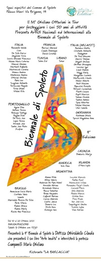 locandina-Biennale-Spoleto-inSPOLETO (PG) – Saranno circa 100 gli artisti provenienti da Italia, Francia, Tunisia, Libano, Portogallo, Germania, Croazia, America, Irlanda, Brasile ed Argentina che daranno vita alla quarta edizione della “Biennale di Spoleto”, in programma dal 10 al 20 ottobre presso gli spazi espositivi del Comune di Spoleto, situati a palazzo Mauri in via Brignone 14.
