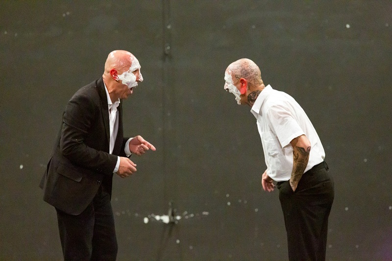 Abbiamo scelto di lavorare a partire da uno spazio vuoto, da una coppia di performer che lavora su azioni fisiche comiche, slapstick e gag.