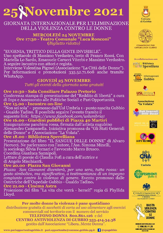GUBBIO (PG) – Si comincia mercoledì pomeriggio, a teatro, con “Eugenia, trittico della gente invisibile”, spettacolo di Massimo Verdastro che narra le vicende di una donna che, all’inizio degli anni 60, subisce una violenza ad opera di un gruppo di giovani coetanei e che a distanza di quarant’anni si toglie la vita ritenendo che il suo sacrificio sia l’unica via per poter avere giustizia. La Giornata internazionale per l’eliminazione della violenza sulle donne verrà celebrata a Gubbio per due giorni, con una serie di iniziative promosse dalla Commissione Pari Opportunità e presentate questa mattina dall’assessora Simona Minelli, dal sindaco Filippo Stirati e dalla presidente della Commissione Lucia D’Acri. Allo spettacolo di mercoledì sera, al termine del quale si terrà un incontro con attori e regista (info e prenotazioni 335.5171608), seguiranno, giovedì 25, una serie di iniziative e appuntamenti. Si parte alle 10,30 a Palazzo Pretorio, con la presentazione, in conferenza stampa, del “Reddito di libertà”, a cura di Inps e assessorato alle Politiche Sociali e alle Pari Opportunità. Si prosegue il pomeriggio alle 15, con un incontro online promosso da Usl Umbria 1 dal titolo “Non sei sola” (evento live al link https://www.facebook.com/uslumbria1), mentre alle 16, ai giardini pubblici di Piazza 40 Martiri, verrà inaugurata la panchina rossa firmata dall’artista eugubino Alessandro Campanella, un’iniziativa promossa dall’associazione “La Volata” e da “Gli stati generali delle donne”.
