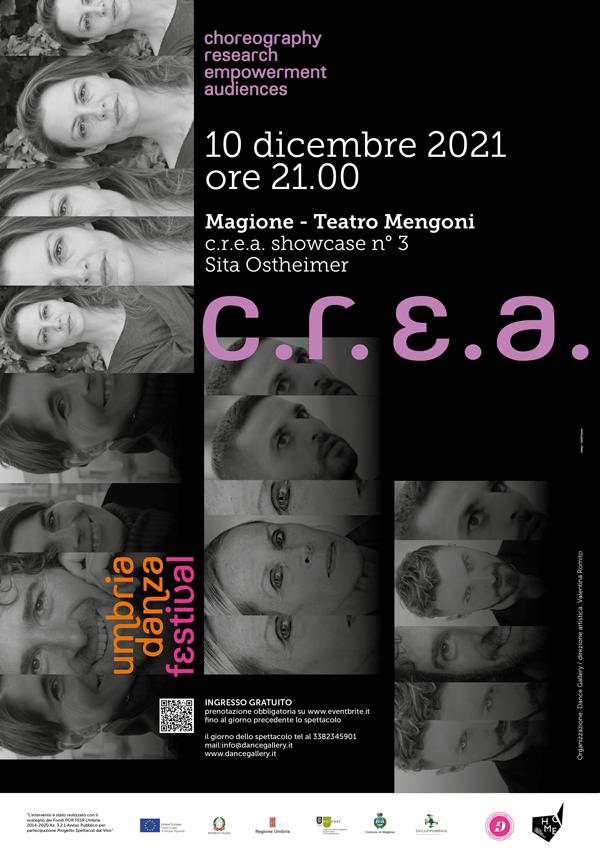 Iniziato nel mese di ottobre 2021, il progetto formativo C.R.E.A. – cantiere coreografico pensato per giovani danzatori contemporanei tra i 18 e i 30 anni – proseguirà fino a marzo 2022. Sei mesi in tutto, una settimana di lavoro al mese, per un totale di 180 ore di formazione e 50 ore di project work, guidate da riconosciuti e prestigiosi artisti internazionali: German Jauregui/compagnia Ultima Vez di Wim Vandekeybus; Marta Coronado/compagnia Rosas di Anne Teresa De Keersmaeker e collettivo House of Bertha; Sita Ostheimer/compagnia Sita Ostheimer; Nico Monaco/compagnia olandese Emio Greco/PC e Akram Khan; Stefano Mazzotta/compagnia Zerogrammi; Carolyn Carlson. Al termine di ogni modulo di lavoro si presenteranno a diversi pubblici della regione in una restituzione scenica del percorso realizzato.