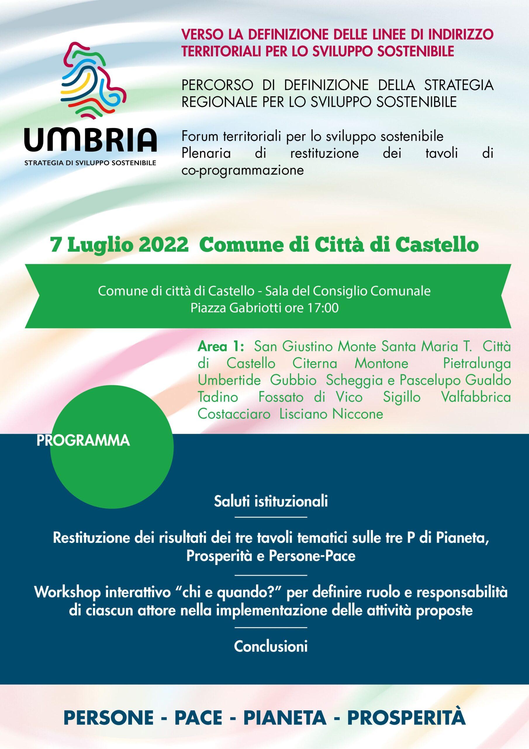 PERUGIA – Cinque incontri programmati in altrettante città umbre per la restituzione dei risultati della prima fase dei Forum e per interrogarsi sul “Chi, cosa e quando?” per dare attuazione al processo di localizzazione dei Lineamenti preliminari per la definizione della strategia regionale per lo sviluppo sostenibile nelle 6 aree in cui è stata suddiviso il territorio regionale. Il progetto è promosso dalla Regione Umbria e attuato da Anci Umbria e Felcos Umbria. Il primo degli appuntamenti è in programma giovedì 7 luglio, alle ore 17, presso la sala del Consiglio Comunale di Città di Castello in cui si riuniranno in presenza e da remoto gli attori dell’Area 1 – Alta Umbria. All’incontro sono stati invitati i sindaci dei Comuni di San Giustino, Monte Santa Maria Tiberina, Città di Castello, Citerna, Montone, Pietralunga, Umbertide, Gubbio, Scheggia e Pascelupo, Gualdo Tadino, Fossato di Vico, Sigillo, Valfabbrica, Costacciaro, Lisciano Niccone.