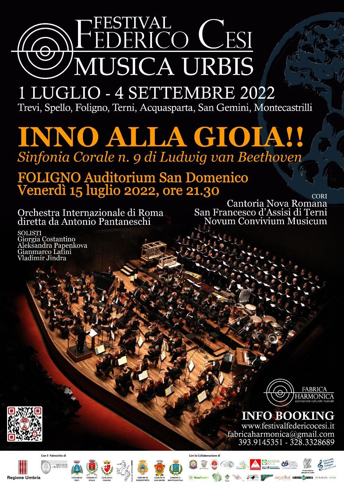 Il primo grande appuntamento con la musica classica è quello previsto venerdì 15 luglio, alle ore 21,30, nello splendido Auditorium San Domenico a Foligno dove risuoneranno le note celebri dell’“Inno alla Gioia!”, ultimo movimento della Sinfonia corale n. 9 op. 125 di Ludwig Van Beethoven per soli, coro e orchestra. La Sinfonia rappresenta senza dubbio l’opera più impegnativa e simbolica del compositore, il lascito più significativo pochi anni prima della sua morte. L’esecuzione porterà sul palco dell’Auditorium oltre 130 musicisti con 3 formazioni corali preparate da Maria Cristina Luchetti ed Annalisa Pellegrini: i cori Cantoria Nova Romana, San Francesco d’Assisi di Terni, Novum Convivium Musicum; l’Orchestra Internazionale di Roma; il cast internazionale dei solisti con Giorgia Costantino (soprano), Aleksandra Papenkova (contralto), Stefano Latini (tenore), Vladimir Jindra (baritono); il tutto concertato e magistralmente diretto dal maestro Antonio Pantaneschi. Un grandissimo e memorabile evento che coinvolge molte realtà musicali del territorio, tra cui brilla la collaborazione con la Gioventù Musicale di Foligno. Info e booking: www.festivalfedericocesi.it, fabricaharmonica@gmail.com, 393 9145351, 328 3328689.