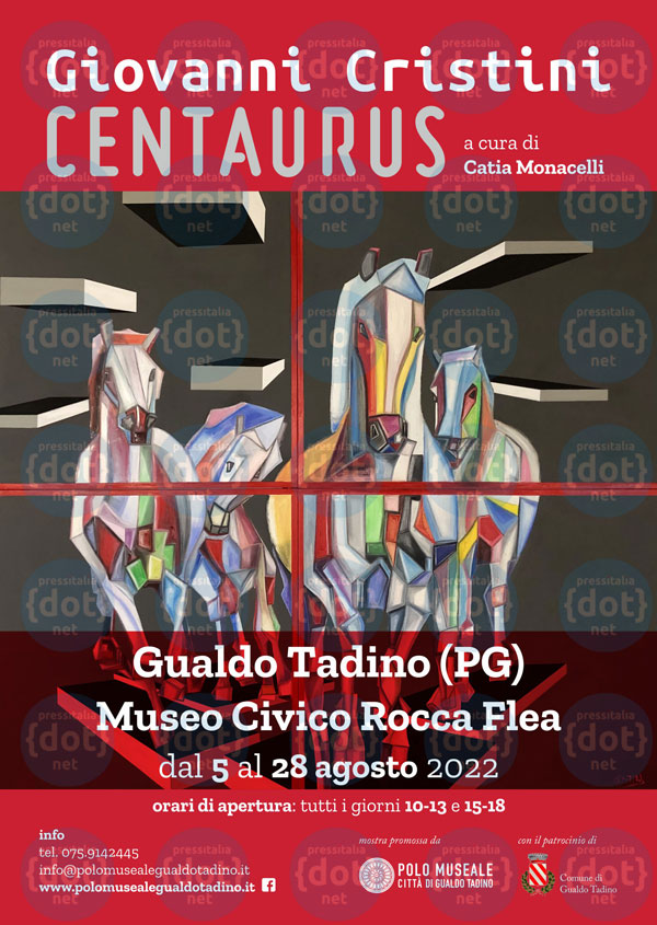 GUALDO TADINO (PG) – A Gualdo Tadino, presso il Museo Civico Rocca Flea, sarà inaugurata sabato 5 agosto alle ore 17.00 la mostra di Giovanni Cristini, a cura di Catia Monacelli, promossa dal Polo Museale, con il patrocinio del Comune di Gualdo Tadino. Nato a Iseo, l’artista oggi vive e dipinge nel suo studio-laboratorio tra le montagne bresciane della Valle Camonica. “Centaurus”, titolo dell’esposizione che evoca la costellazione dell’emisfero australe, dove si trovano le stelle più vicine al pianeta Terra, ma anche l’idea dell’animale mitologico, metà uomo e metà cavallo, è in realtà un trionfo di forme geometriche e colorate, in cui tori, cavalli e un nuovo “Umanesimo” si incontrano, per dare vita ad opere grandissime, di rara potenza e bellezza, che invadono gli spazi abitati del castello e comunicano tra loro e con l’arte antica.
