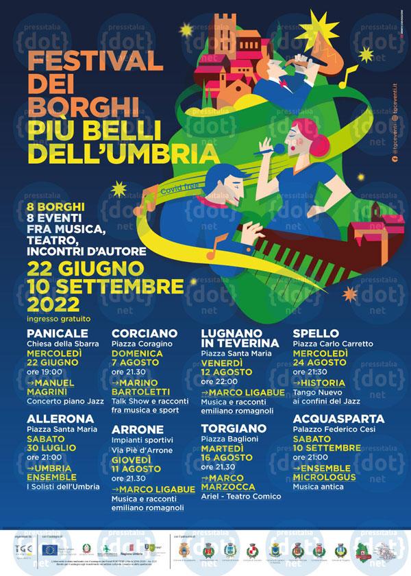 IL CALENDARIO DEGLI EVENTI 2022. Dopo le tappe a Panicale, Allerona, Corciano, Arrone, Lugnano in Teverina e Torgiano, il festival dei borghi più belli dell’Umbria 2022 proseguirà mercoledì 24 agosto a Spello (Piazza Carlo Carretto, ore 21.30) con Historia Tango Nuevo ai confini del jazz, spettacolo tra poesia, musica e ballo con la partecipazione di Samuel Peron e Veera Kinnunen; e infine sabato10 settembre ad Acquasparta (Palazzo Federico Cesi, ore 21.00) con la musica antica dell’ Ensemble Micrologus.