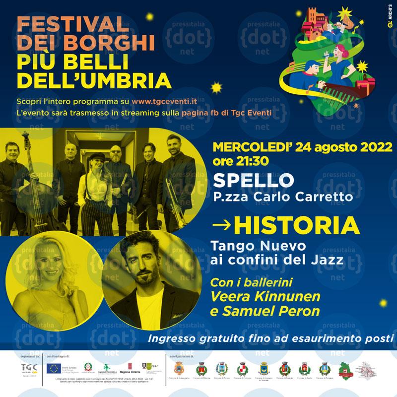 SPELLO (PG) – Il Festival dei Borghi più belli dell’Umbria approda a Spello mercoledì 24 agosto (ore 21,30 in Piazza Carlo Carretto) con lo spettacolo ad alto coinvolgimento di “Historia, Tango Nuevo ai confini del jazz”. Protagonisti della serata (a ingresso libero fino ad esaurimento posti) sono sei musicisti, di cui quattro umbri, uniti dalla passione per un sound raffinato, la vocalità di una straordinaria interprete e il sentimento travolgente del ballo a due. Il programma musicale spazierà dal son cubano di Miguel Metamoroso, Osvaldo Farrès e Isolina Carrillo fino al pop internazionale di Sting, Cher e Pino Daniele, attraverso l’eleganza del Tango, del Bolero latino, del Tango Flamenco arrangiati anche in chiave jazzistica. Saliranno sul palco, insieme a Stefania Caracciolo (voce), Daniele Bocchini (trombone), Marco Postacchini (sax, flauto, arrangiamenti), Enzo Proietti (pianoforte), Graziano Brufani (contrabbasso) e Leonardo Ramadori (percussioni), anche i ballerini Veera Kinnunen e Samuel Peron, due star delle scene televisive, che aggiungeranno pathos ed erotica emozione alla potenza espressiva del tango moderno.