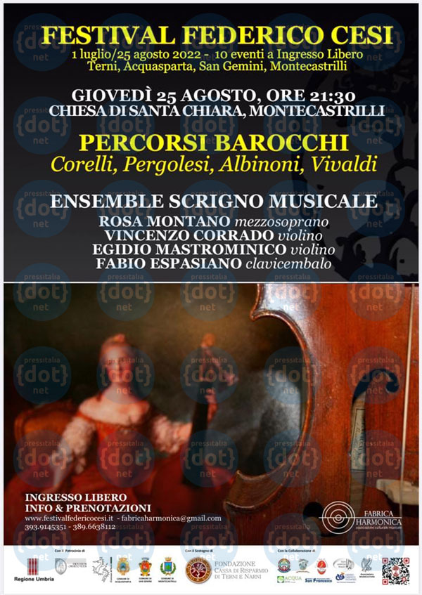 MONTECASTRILLI (TR) – Si terrà giovedì 25 agosto (ore 21,30), presso la chiesa di Santa Chiara a Montecastrilli, l’ultimo concerto della 15esima edizione del Festival Federico Cesi, festival musicale organizzato dall’associazione Fabrica Harmonica nei Comuni di Terni, Acquasparta, Montecastrilli e San Gemini. Lo spettacolo, dedicato ai “Percorsi Barocchi, passacagli, sonate e mottetti da Napoli a Venezia”, sarà ad ingresso gratuito (con prenotazione obbligatoria: fabricaharmonica@gmail.com, 393 9145351, 389 6638112) grazie al sostegno della Fondazione Cassa di Risparmio di Terni e Narni (Carit). Un appuntamento imperdibile che fonderà la grande musica (eseguita con strumenti d’epoca) con l’architettura (la chiesa, afferente al convento delle suore Clarisse di Montecastrilli, presenta stucchi barocchi e sarà eccezionalmente aperta al pubblico per l’occasione per gentile concessione della Madre Badessa) per condurre gli spettatori in un immaginario viaggio nella cultura italiana del XVII e XVIII secolo.