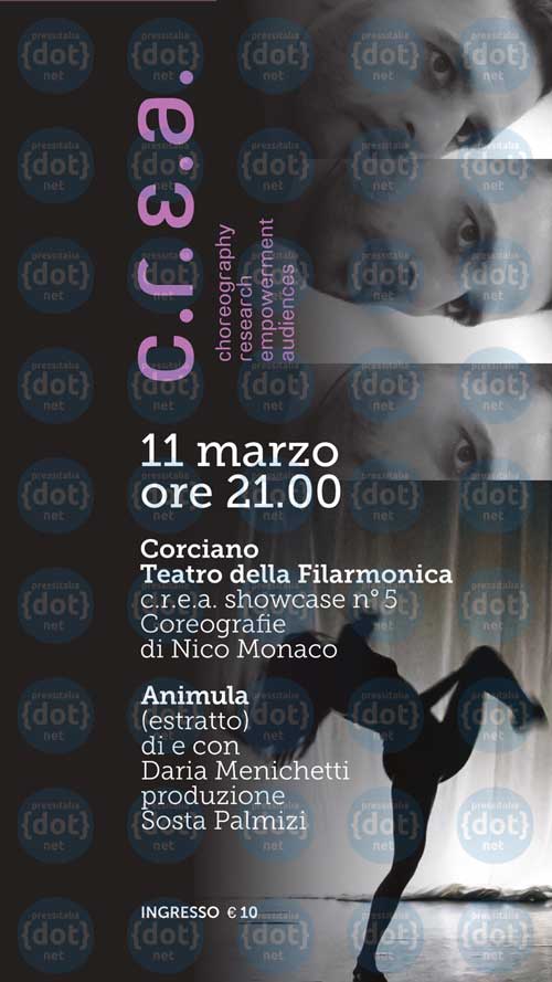 In Animula, un assolo che vede Daria Menichetti in scena sia come interprete che come coreografa, viene esplorato il corpo come paradosso tra fisicità e spiritualità in relazione alla presa di coscienza dell’essere mortali. Una figura composta e contenuta, ben truccata, filo di perle al collo, come una statuetta di cera, si aggira esposta in questo luogo, quasi fosse sotto osservazione ma contemporaneamente invisibile. Una piccola anima smarrita, intrappolata ancora in questa terra, in fuga dal corpo. Visibile forse solo a chi la vuol vedere. Attraversa e anima questo luogo incolore, arduo e spoglio, quasi a compiere un silenzioso, magico e misterioso rituale. Tra il corpo e l’anima. La produzione è dell’Associazione Sosta Palmizi con il sostegno di MiC, Regione Toscana/Sistema Regionale dello Spettacolo. A seguire, sempre sul palco di Corciano, C.R.E.A. Showcase n°5 (2aedizione), coreografie di Nico Monaco, danzatore della compagnia olandese Emio Greco/PC e Akram Khan. Come spiega Valentina Romito, direttrice di Dance Gallery: “Ci ho tenuto ad aprire e chiudere questa edizione di C.R.E.A. invitando nelle giornate di restituzione in teatro due artiste che si sono formate nella scuola di Dance Gallery e ora sono apprezzate interpreti e autrici della scena contemporanea italiana – Amina Amici e Daria Menichetti per dare un segnale che con la giusta preparazione, il talento e un percorso di qualità si può costruire un futuro professionale nella danza in Italia”.