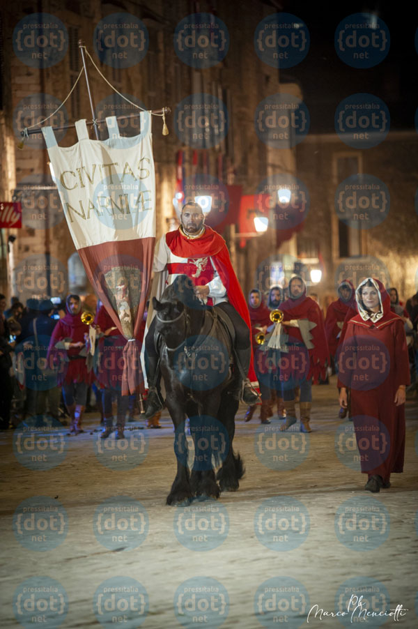 Circa mille i costumanti che andranno a comporre il Grande Corteo Storico che sfilerà in notturna sabato 13 maggio a partire dalle 21 con partenza da piazza dei Priori, la fu Platea Maior, in cui si ritroveranno i tre Terzieri. Il corteo, che rievoca la suggestiva processione in onore del patrono San Giovenale del 1371, procederà al chiarore di fiaccole e lumi e al ritmo dei musici lungo le vie e le piazze di Narni, come di consueto, seguendo l’ordine di arrivo dell’anno precedente (Mezule, Santa Maria, Fraporta), tra autorità, rappresentanze militari, cavalieri della corsa, corporazioni delle arti e nobili casate delle antiche famiglie, preceduto dal gruppo delle magistrature comunali e pontificie con in testa i propri gonfaloni e stendardi.
