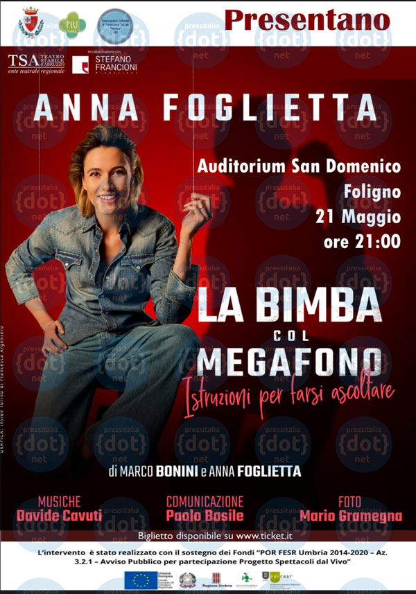 FOLIGNO (PG) – Sarà Anna Foglietta la protagonista del prossimo appuntamento, di fatto il quinto, della rassegna di spettacoli dal vivo “Performer in Umbria – PIU”, promosso dall’Associazione Culturale di Promozione Sociale “Aurora” APS. L’attrice romana sarà a Foligno domenica 21 maggio, alle 21, quando porterà sul palco dell’Auditorium San Domenico lo spettacolo “La bimba col megafono. Come farsi ascoltare” con la regia curata dalla stessa Foglietta insieme al collega Marco Bonini.