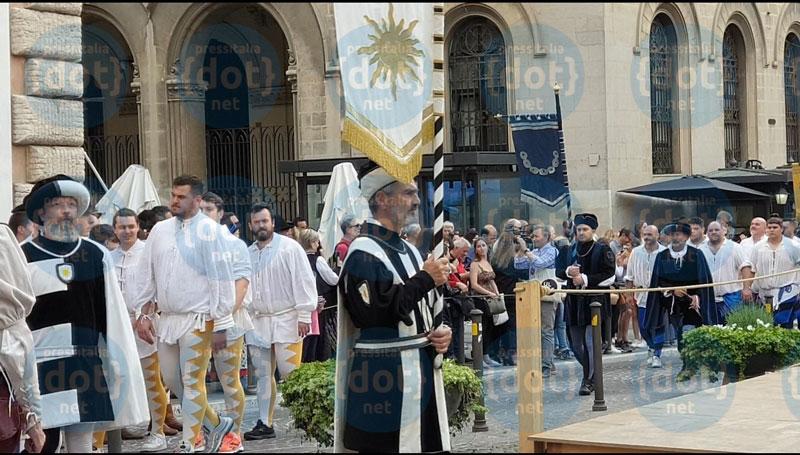 Ma il momento culmine del Palio 2023 andrà in scena oggi, domenica 11 giugno, ultimo giorno della rievocazione storica in corso nel centro storico perugino ed organizzata dall’Associazione Perugia1416 Aps. Sono in programma le ultime due e decisive gare: il Gran Corteo Storico e la Corsa del Drappo. Tutto si incentrerà in poco più di 2 ore con alle ore 17 la partenza del Corteo della Reggenza dalla sede di Perugia1416 (situata in via Oberdan 50) seguito da quello di Braccio Fortebracci che da piazza Italia partirà percorrendo tutto Corso Vannucci per ricongiungersi all’altro in piazza Grande (piazza IV Novembre). Qui avverrà l’incontro tra i due cortei e il primo Priore nero, del Nobile Collegio della mercanzia, accoglierà Braccio quale nuovo signore della Città consegnandogli sotto il Grifo, simbolo di Perugia, le chiavi della città. Subito dopo (alle ore 17,40 circa) i cinque Rioni, interpretando il tema univoco 2023, sfileranno nell’ordine della classifica della precedente edizione. Il Gran Corteo in onore di Braccio partirà da piazza della Repubblica, attraverserà Corso Vannucci per arrivare in piazza IV Novembre. I 5 Rioni saranno giudicati dalla Giuria per l’attinenza storica, l’interpretazione e la scenografia. Il Gran Corteo proseguirà con la sfilata, nell’ordine, delle delegazioni ospiti: Montone (Donazione della Santa Spina), Gualdo Tadino (Giochi delle Porte), Camerino (Corsa alla Spada e Palio – Soavi Allegrezze dei Da Varano – Aspidum Sagittas); Senigallia (Il Solenne Ingresso), Visso (Torneo delle Guaite),  Todi (La Disfida di S.Fortunato – Arcus Tuder). Ad aprire il Corteo saranno gli Sbandieratori di Gubbio. Per tutta la durata del corteo questo non dovrà essere attraversato pertanto, insieme alla Galleria Nazionale, si invita coloro che sono diretti a vedere la mostra sul Perugino a non attraversarlo, percorrendo eventualmente vie alternative.
