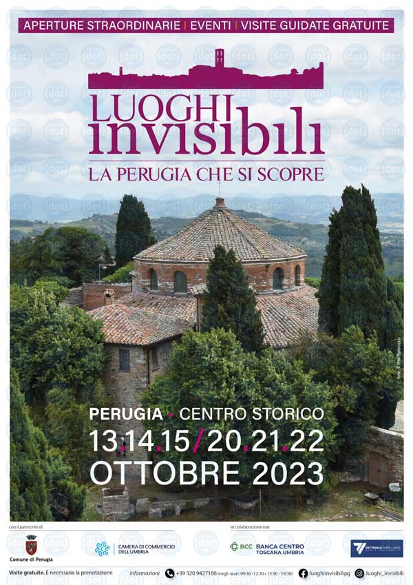PERUGIA – Nei due weekend dal 13 al 15 e dal 20 al 22 ottobre torna nell’acropoli perugina “Luoghi Invisibili. La Perugia che si scopre”, la manifestazione giunta alla sua nona edizione che è ormai diventata un appuntamento tradizionale per gli amanti della storia e dell’arte, atteso da tanti cittadini, visitatori umbri e turisti di confine. Nei due weekend centrali di ottobre il centro storico si anima con aperture straordinarie, eventi, inedite visite guidate gratuite anche in compagnia dei “padroni di casa” alla scoperta di palazzi storici, sedi museali e tanti altri luoghi ricchi di storia e di arte che sono normalmente inaccessibili al pubblico e poco conosciuti. Per tutte le visite è necessaria la prenotazione telefonica al 320-9427106 (nelle fasce orarie 09,30-12,30 e 15,30 -18,30) per monitorare il numero di partecipanti in base alla capienza dei siti e garantire un’esperienza piacevole a tutti i partecipanti.