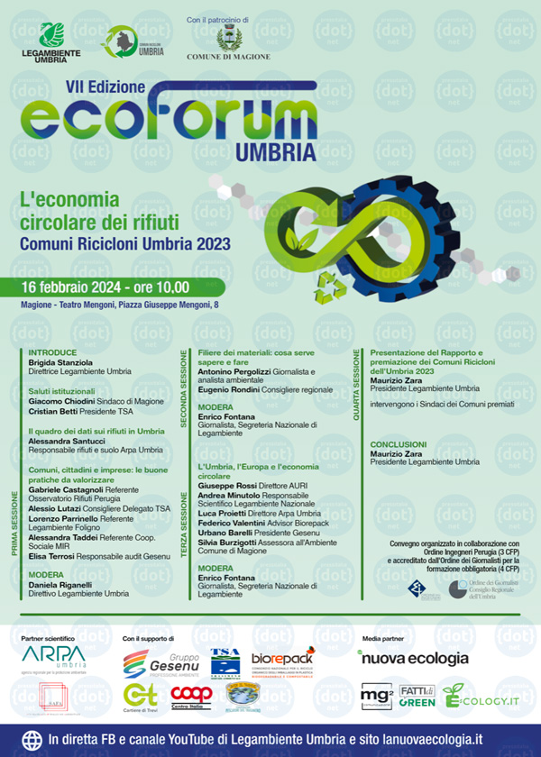 Programma-Ecoforum-Umbria-2024-inMAGIONE (PG) – Numeri, scenari, criticità e sviluppi del sistema di raccolta e gestione dei rifiuti in Umbria. Torna L’EcoForum sull’economia circolare dei rifiuti. Legambiente Umbria, venerdì 16 febbraio, dà appuntamento a cittadini, amministratori e addetti ai lavori al Teatro Mengoni di Magione.