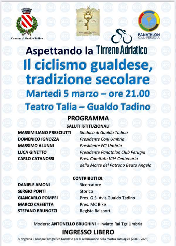 GUALDO TADINO (PG) – Martedì 5 marzo alle ore 21 si terrà presso il teatro Talia di Gualdo Tadino un convegno dal titolo “Il ciclismo Gualdese tradizione secolare” organizzato dal Comitato VII centenario della morte del Patrono Beato Angelo, dal Comune di Gualdo Tadino e da Panathlon club Perugia.
