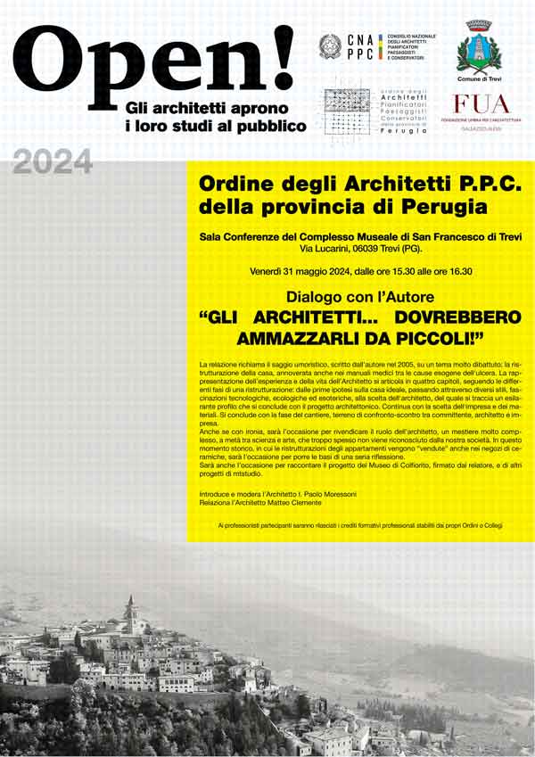 TREVI (PG) – Venerdì 31 maggio ritorna “Open! Studi Aperti”, l’evento nazionale organizzato dal CNAPPC (Consiglio Nazionale degli Architetti, Pianificatori, Paesaggisti e Conservatori) per promuovere e diffondere la cultura architettonica in tutta Italia. Quest’anno l’Ordine degli Architetti PPC (Pianificatori, Paesaggisti e Conservatori) della provincia di Perugia lo organizza a Trevi, con l’obiettivo di continuare il suo itinerario all’interno dei beni culturali del territorio, presso la sala conferenze del complesso museale di San Francesco, il cuo intervento di restauro è stato di recente ultimato. L’evento, patrocinato dalla Fondazione Umbra per l’Architettura e dal Comune di Trevi, è suddiviso in cinque momenti.