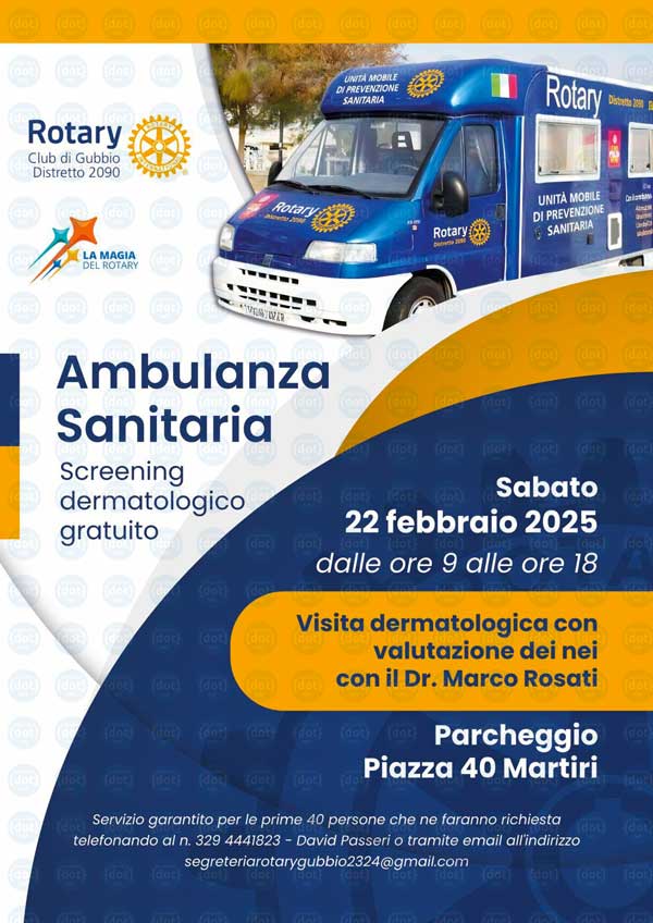 Immagine-WhatsApp-inGUBBIO (PG) – Sabato 22 febbraio arriverà a Gubbio l’ambulanza sanitaria del Rotary Distretto 2090, per offrire uno screening dermatologico gratuito. Il Rotary Club Gubbio vuole celebrare i 120 anni della nascita del Rotary International – spiega il presidente David Passeri –  con un evento di prevenzione sanitaria. Questo screening dermatologico è una delle tante iniziative che il Rotary Club organizza in favore della comunità locale, in collaborazione con professionisti che si mettono a disposizione della collettività. Per questo appuntamento sarà il Dr. Marco Rosati ad effettuare una visita con valutazione gratuita dei nei. Il servizio è garantito per le prime 40 persone che ne faranno richiesta, telefonando al numero 329 4441823 o tramite mail all’indirizzo segreteriarotarygubbio2324@gmail.com.