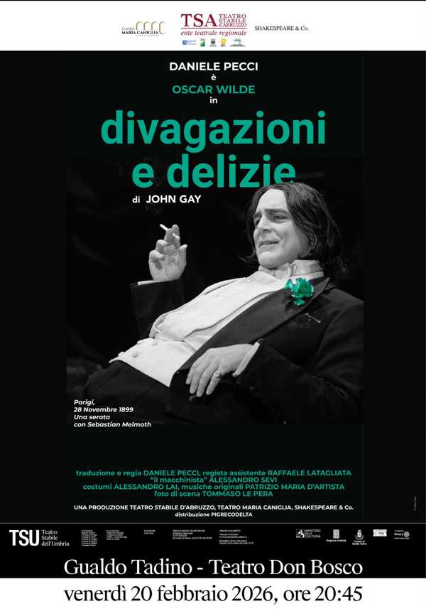 GUALDO TADINO (PG) – Il sipario del Teatro Don Bosco di Gualdo Tadino si riapre questa sera, venerdì 20 febbraio alle ore 20.45, su uno degli appuntamenti più attesi della Stagione di Prosa 25/26. Protagonista assoluto della serata è Daniele Pecci, impegnato nella doppia veste di interprete e regista di Divagazioni e Delizie, il celebre testo di John Gay che ripercorre l’universo umano e letterario di Oscar Wilde. Lo spettacolo, nato dalla collaborazione tra il Teatro Stabile dell’Umbria e il Comune di Gualdo Tadino, rappresenta un viaggio poetico e feroce che attinge direttamente ai romanzi, ai saggi e alle lettere del genio irlandese, restituendo al pubblico un ritratto di straordinaria modernità.